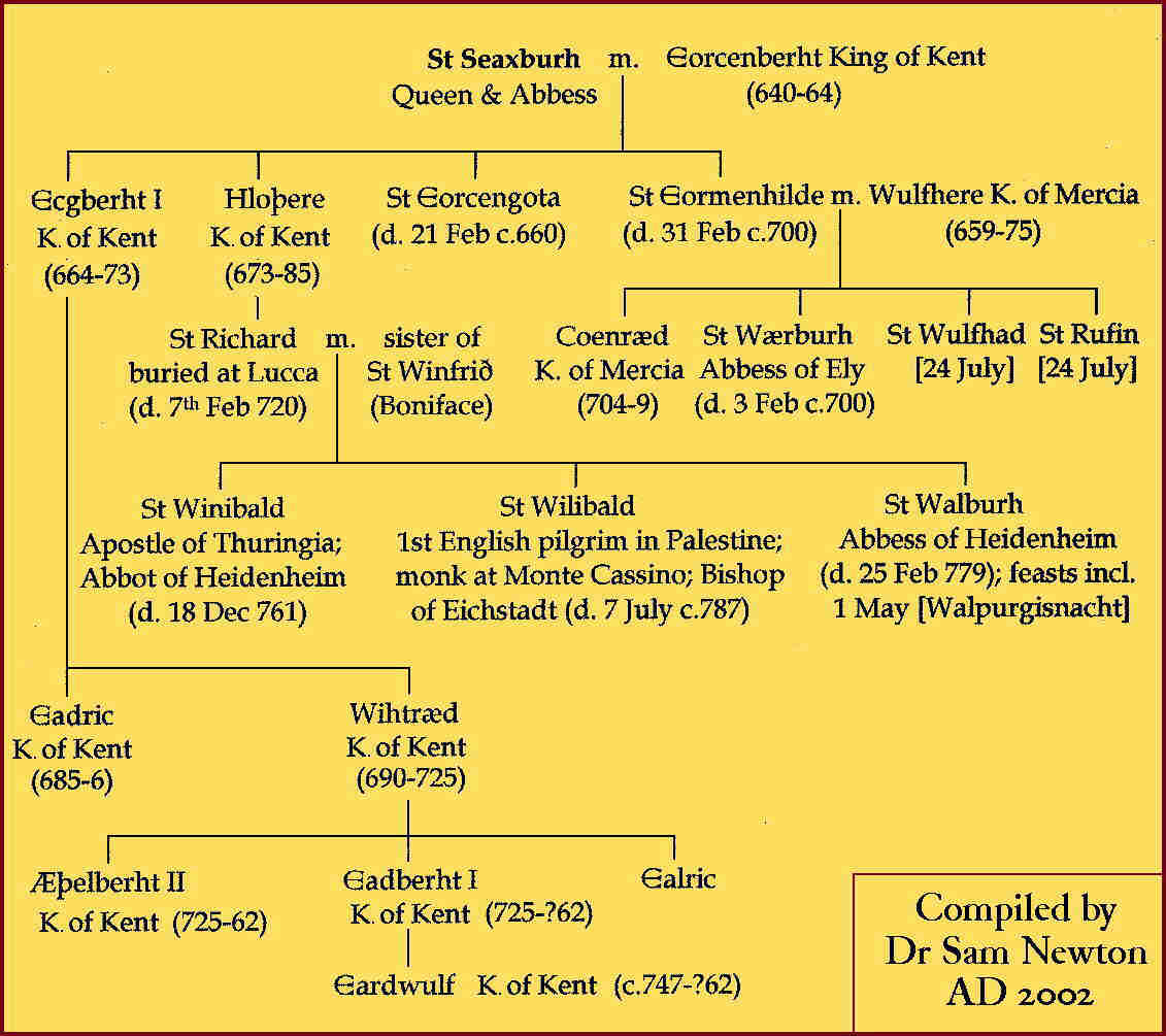 These and other royal and saintly descendants of the Wuffing princess Seaxburh can be seen in the genealogy below.