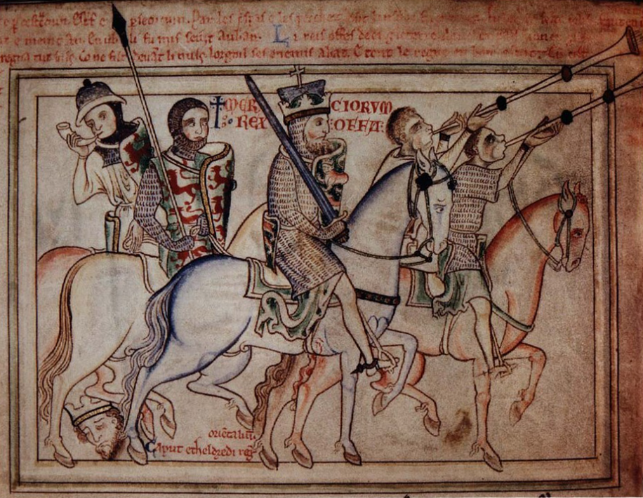 Above: a miniature from the Life of St. Alban by Matthew Paris (c. 1200-1259), depicting Offa as a 13th-century warrior-king riding over the severed head of King Æthelbert of East Anglia, martyed near Hereford on 20th May 794 while visting King Offa and his queen Cynethryth (from Dublin, Trinity College Library, Ms 177 [formerly MS E. I. 40]; thanks to Wikipedia for this Public Domain image).